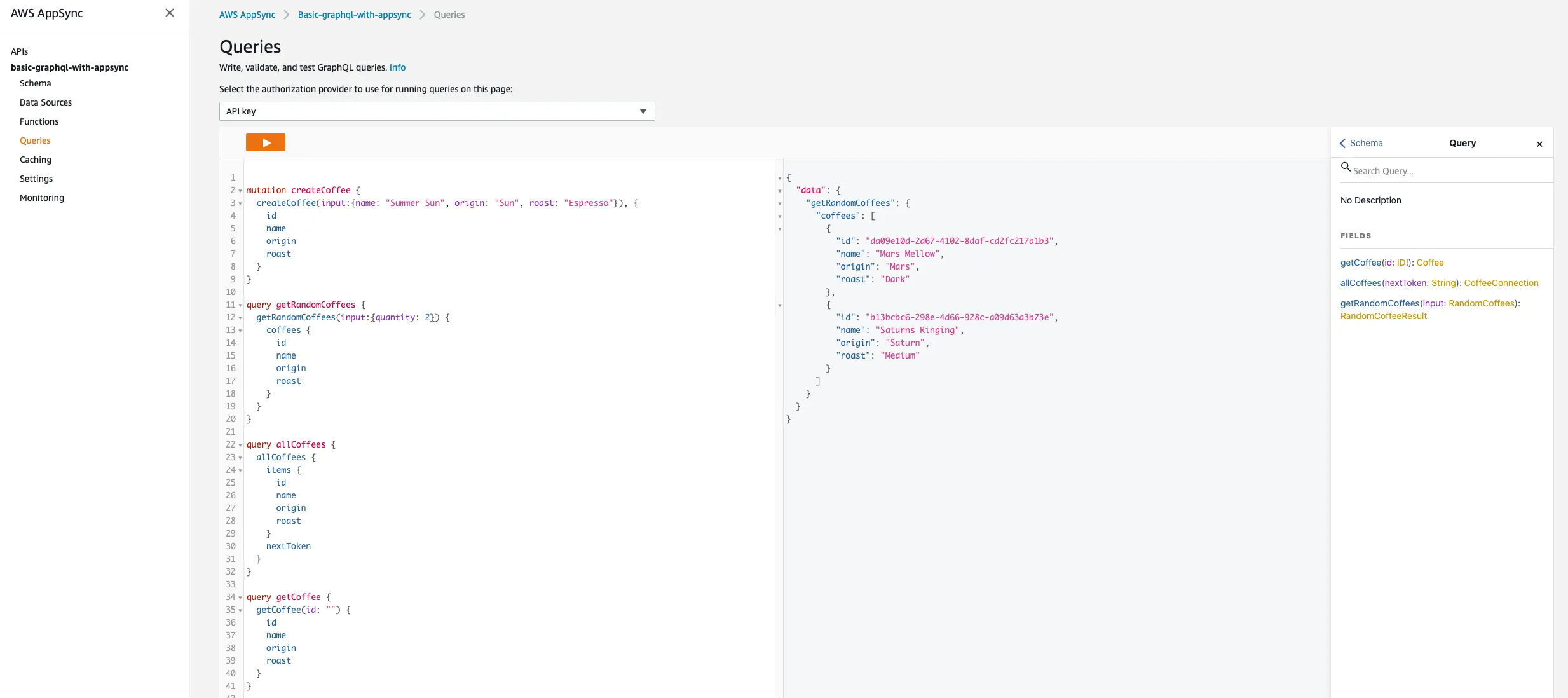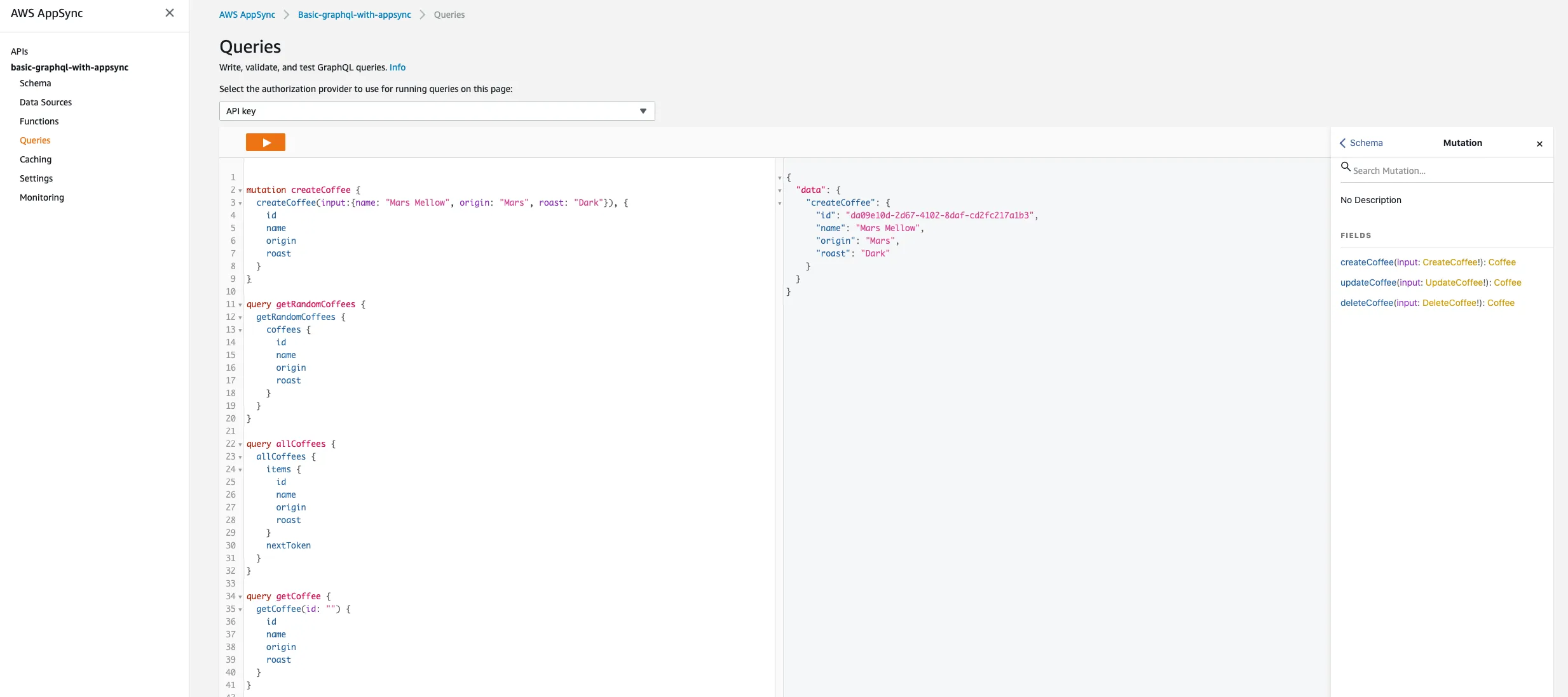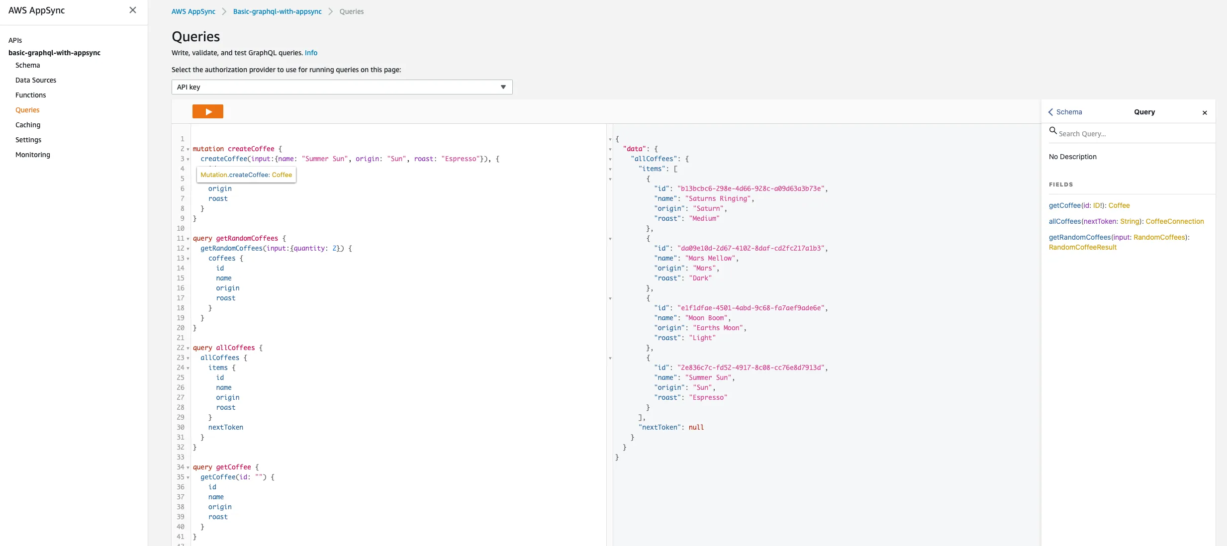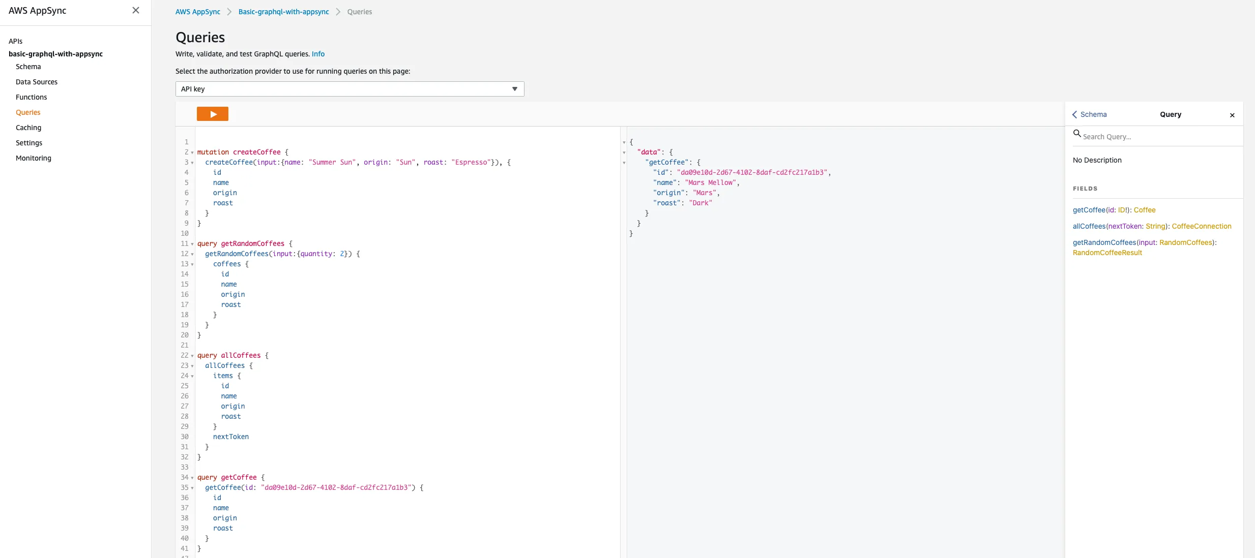 ├── Makefile # Makefile for project├── README.MD # Readme├── functions # Dir for functions (Makefile uses this convention for builds)│ └── getRandomCoffees # Dir for Lambda func and it's tests│ ├── main.go│ └── main_test.go├── go.mod # Go mod files├── go.sum # Go mod files├── models # Dir for go related models│ └── coffee.go├── request-mapping-templates # Request mapping templates for GraphQL resolvers│ ├── generic-result.res.vtl│ ├── mutation-delete-item-by-id.req.vtl│ ├── mutation-put-item-by-id.req.vtl│ ├── query-get-item-by-id.req.vtl│ ├── query-invoke-lambda.req.vtl│ ├── query-invoke-lambda.res.vtl│ ├── query-scan-all-items.req.vtl│ └── query-scan-all-items.res.vtl├── schema.graphql # GraphQL Schema└── template.yaml # AWS Cloudformation template💻 Implementation